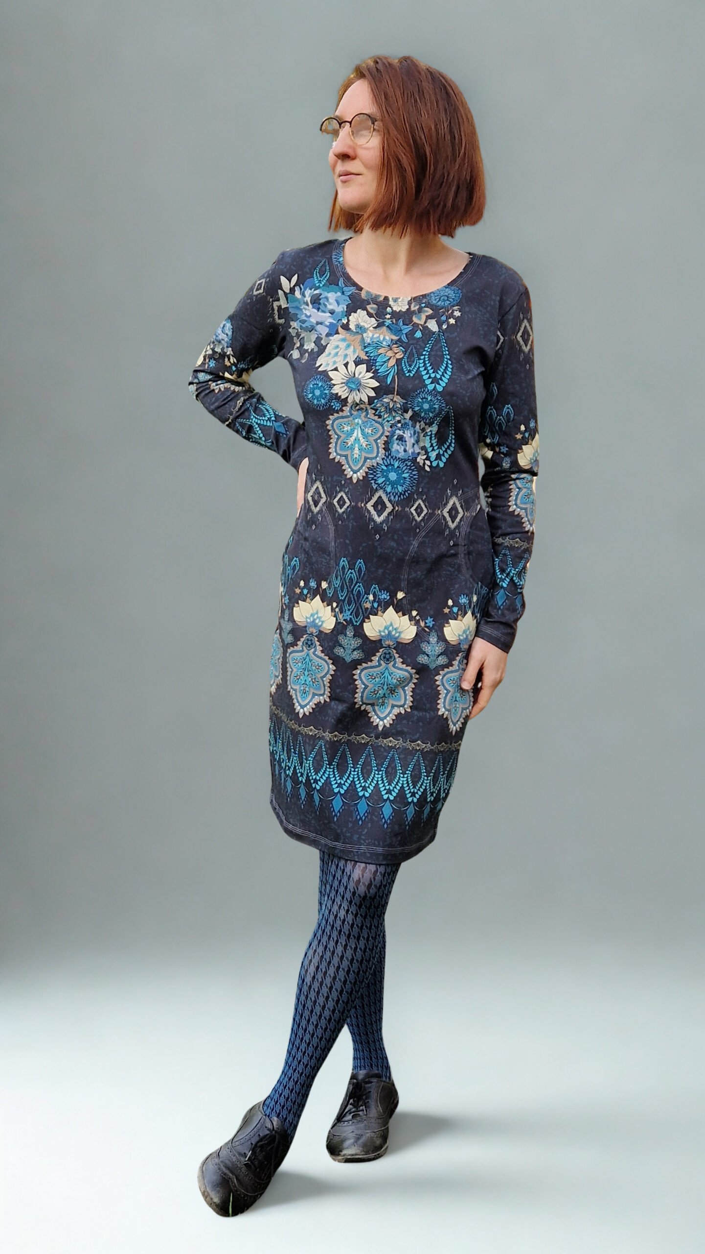 Šaty pouzdrového střihu s kapsami a dlouhým rukávem.