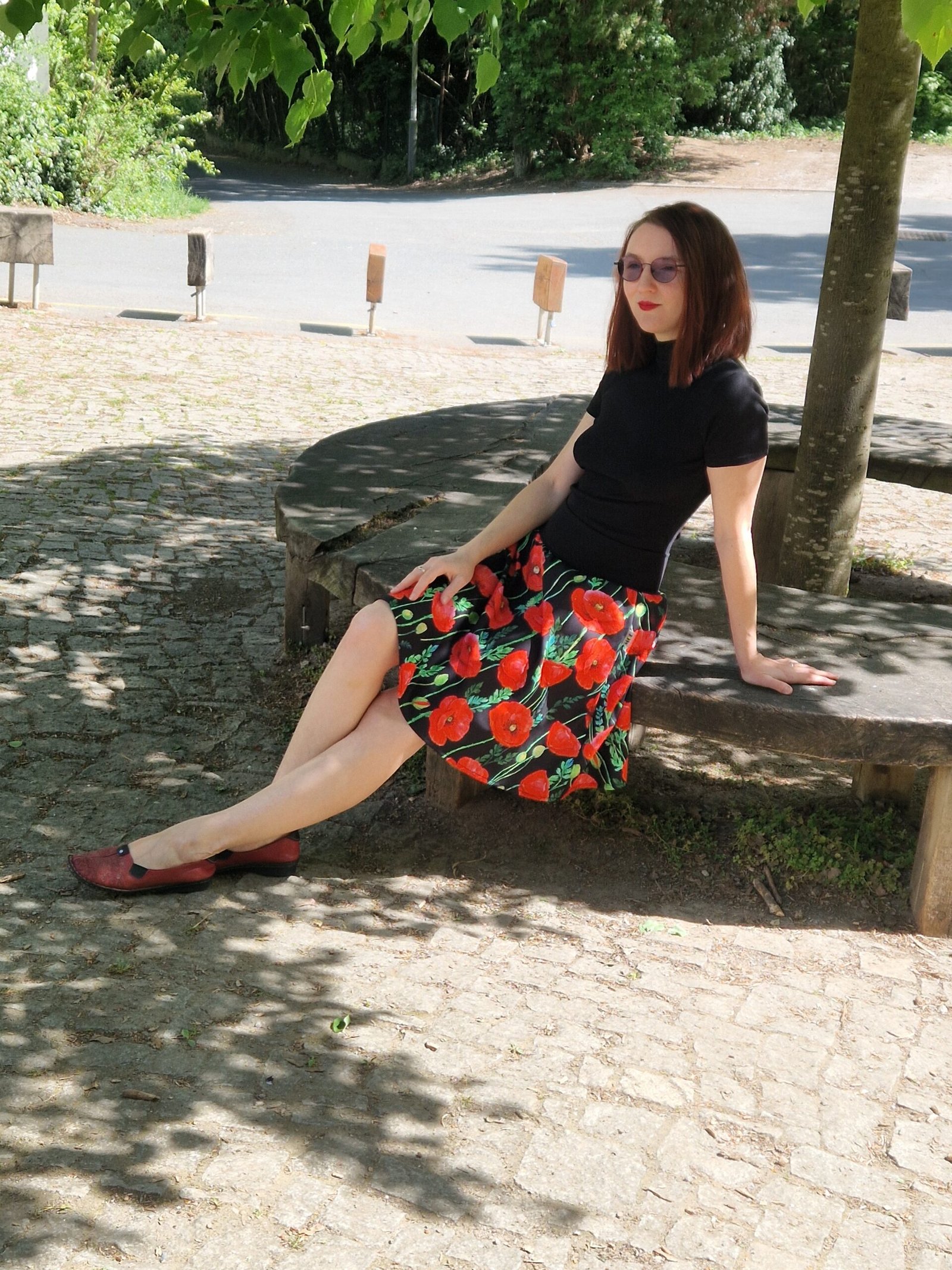 Áčková sukně s pružným pasem. Nádherný vzor vlčích máků dodává eleganci a lehkost.